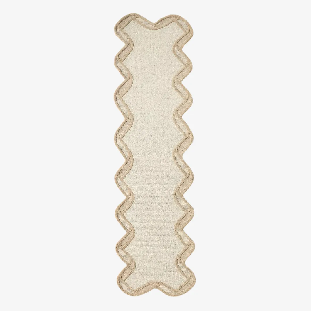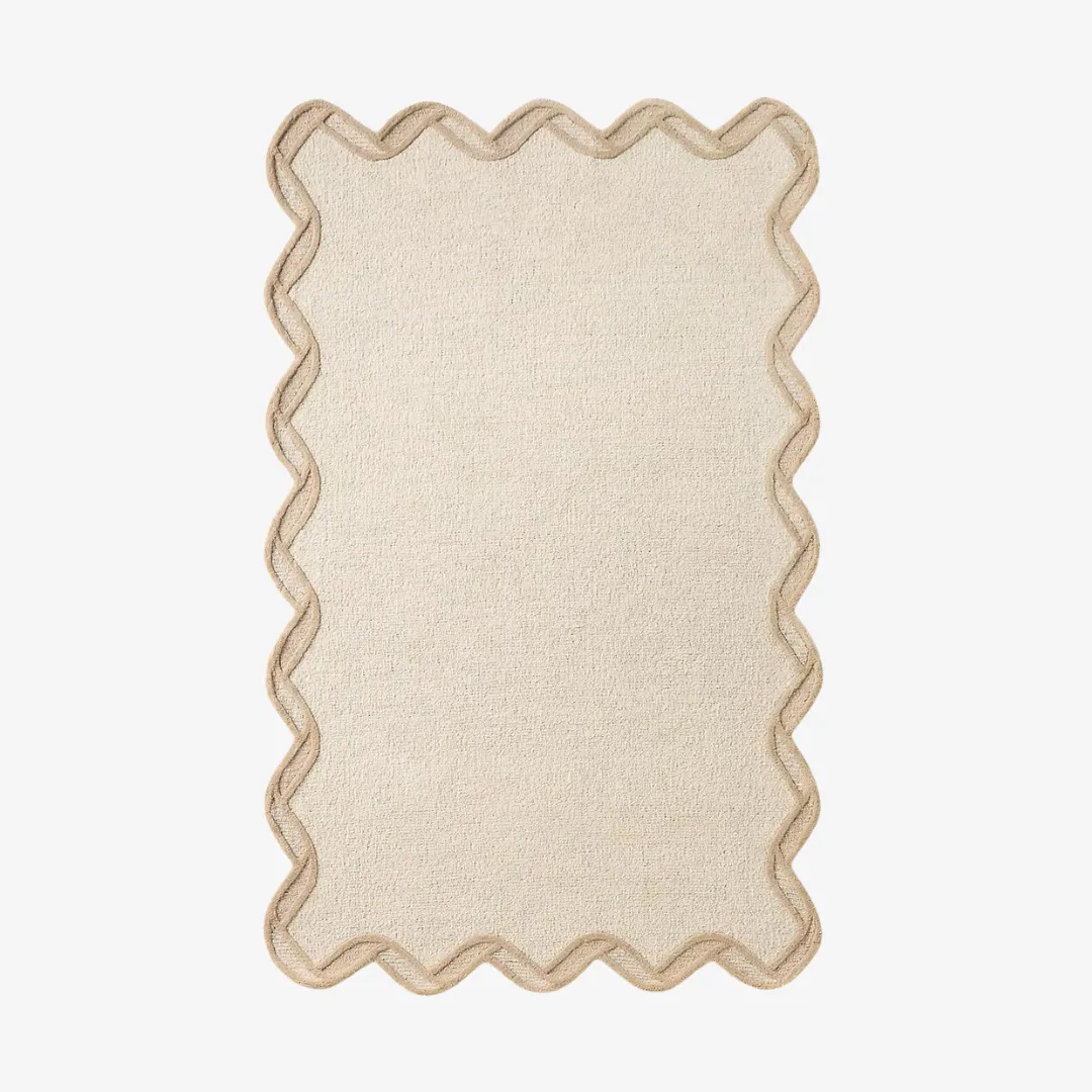This rug presents a classic, laid-back look by combining soft texture with understated design. Its flowing edges and warm neutral tones ground it and provide versatility.- Shape: Rectangular with wavy / rickrack-inspired edge