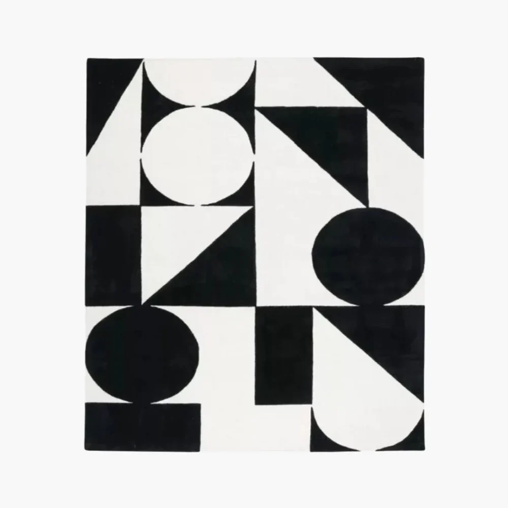 The black and white geometric rug, a strong and contemporary accent meant to change any area, will bring artistic touch to your house. Perfect for modern, minimalist, and contemporary homes, this striking monochromatic rug features an amazing interaction of circles, triangles, and lines.