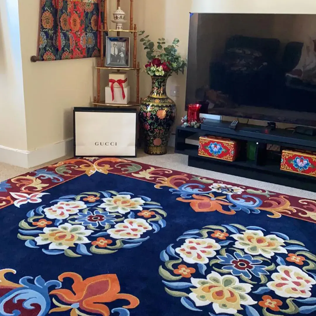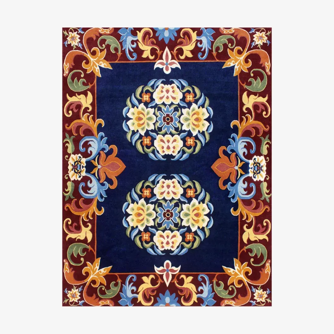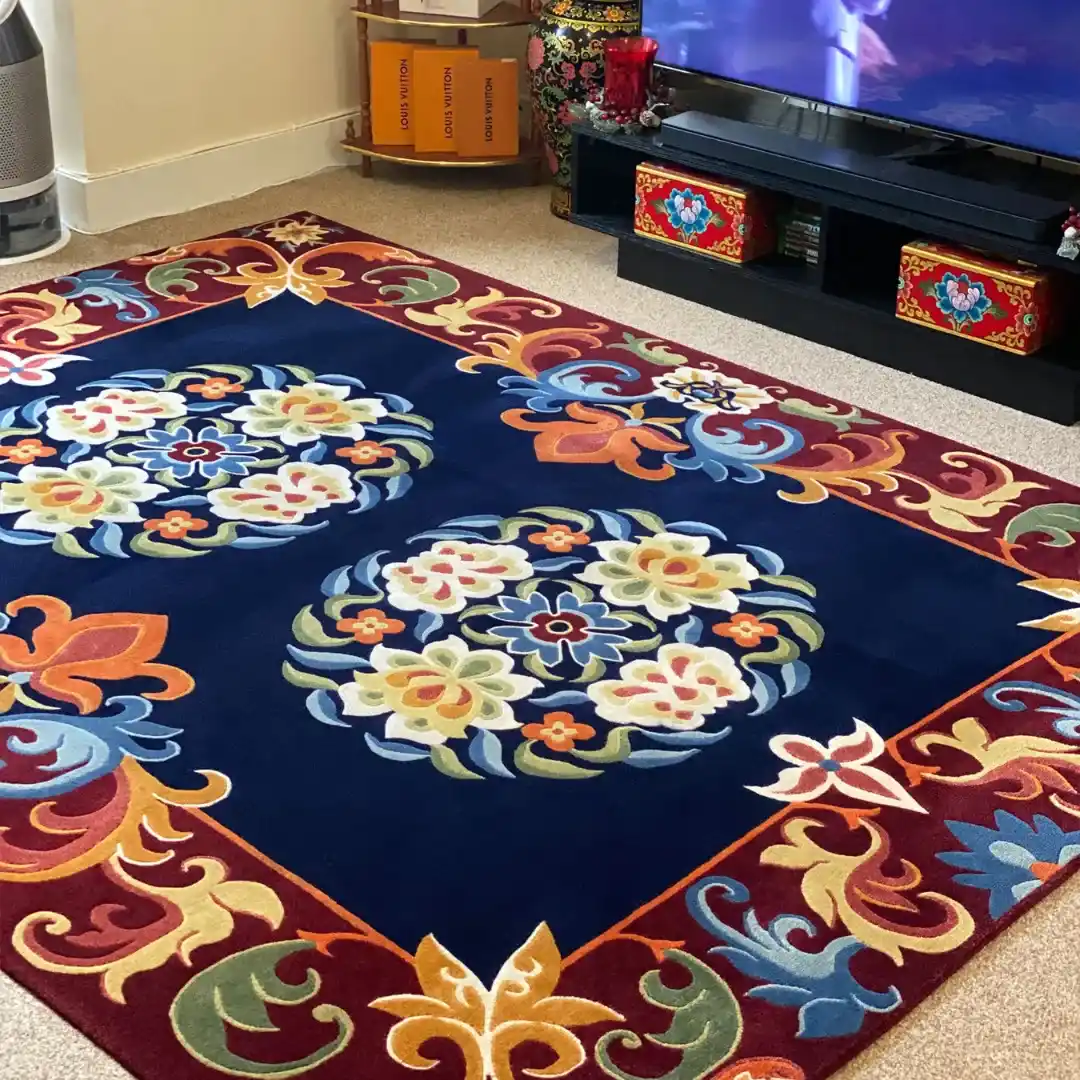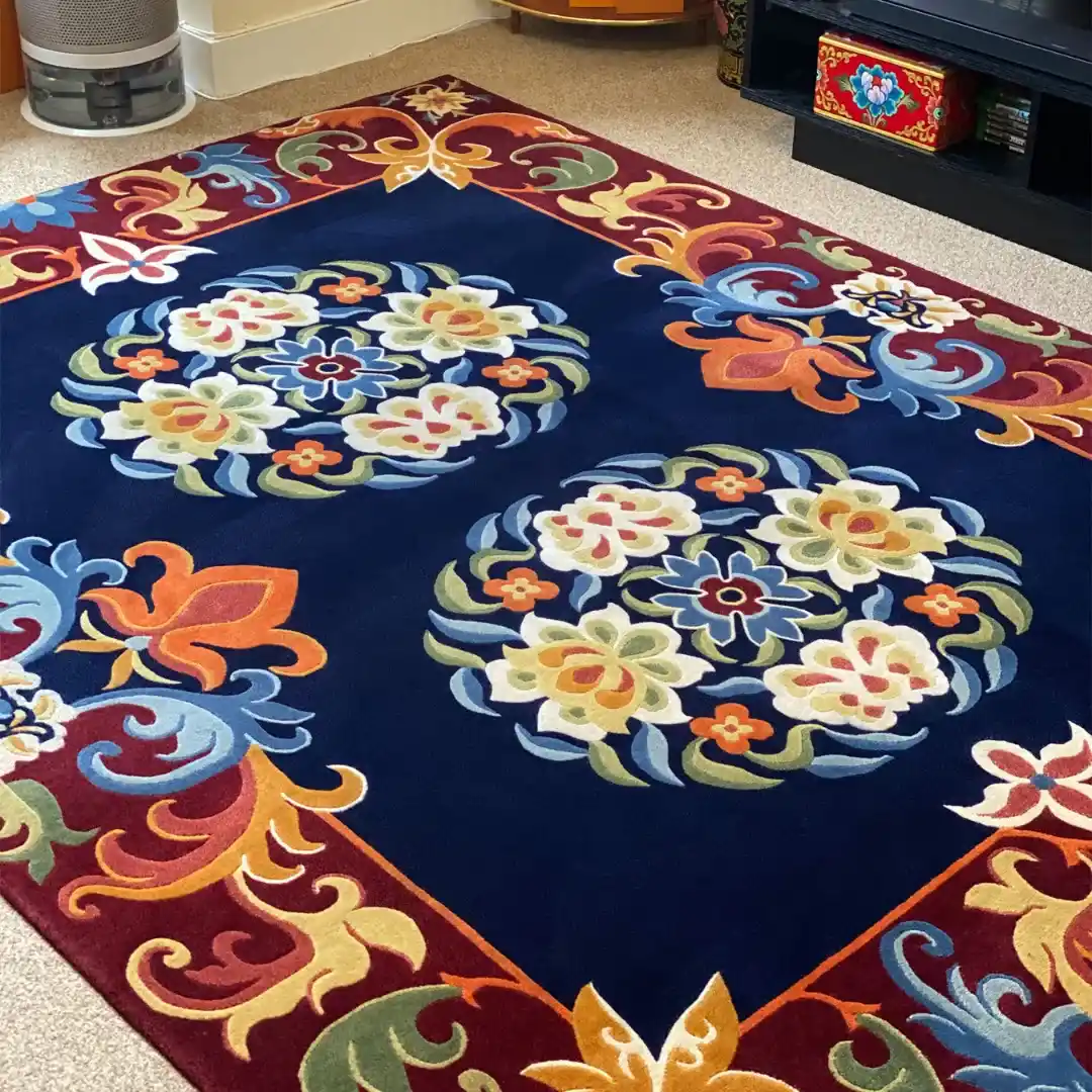 Create a peaceful and vibrant space with the Blue Lotus – Hand Tufted Rug. This rug blends tradition with beauty, featuring red floral motifs blooming against a deep blue background. The design reflects Tibetan culture, where blue stands for calm, healing, and spiritual clarity. Ideal for any modern or mindful home, this wool rug brings both comfort and meaning. Place it in your living room rug layout, enhance your bedroom rug setup, or bring focus to your home office rug.Key Features of the Blue Lotus Rug