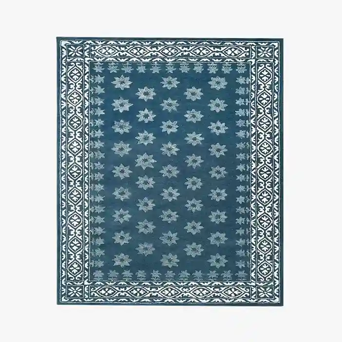 The Sapphire Bloom rug exudes elegance with its intricate blue pattern and exquisite border detailing. Inspired by traditional motifs, this rug brings a sense of refinement and warmth to your living space. Crafted from high-quality materials, it ensures durability and a plush feel underfoot. Its deep blue hues create a striking contrast, making it a perfect fit for modern, classic, or vintage interiors.Key Features of Pattern Rug