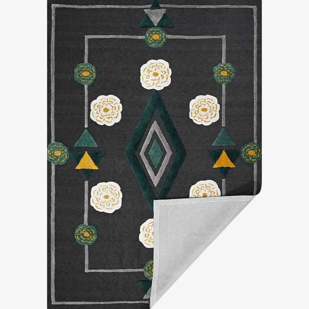 The dark base creates contrast, while the white and green floral patterns offer a calm, nature-inspired feel. Pair it with black rugs or green rugs for a layered, elegant look.Care Instructions