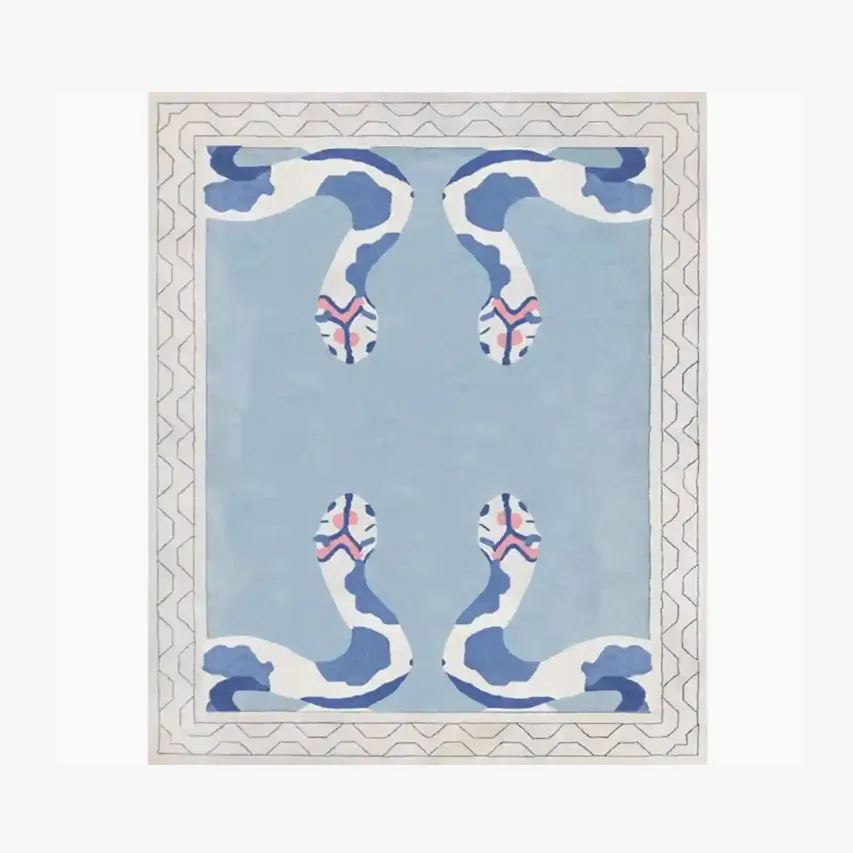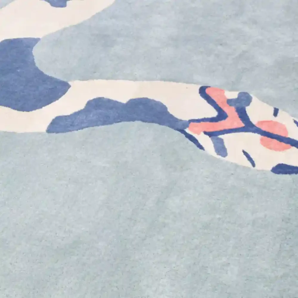 The Charming Snake Area Rug features a striking crawling snake with a soft touch set on a blue base. This design adds a touch of nature and adventure to your home. It pairs effortlessly with neutral interiors and even contrasts beautifully with white area rugs to create a bold, layered look. Our wildlife rug is a one of a kind creations.Key Features for Snake Area Rug