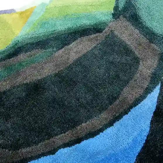 The Delaunay Round Area Rug displays a gray base with vibrant blue, beige, and green abstract. It is a symbol of focus, balance, and luxury. This rug adds a sense of motion and energy to your home.Key Features for Round Area Rug