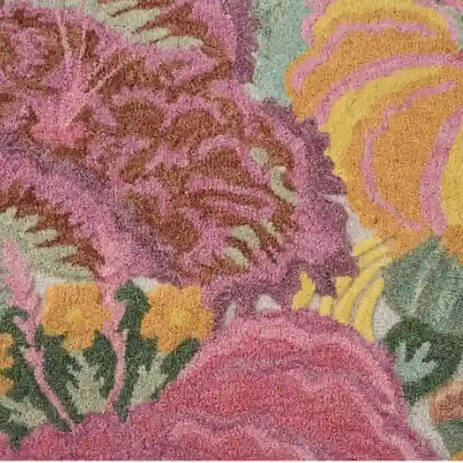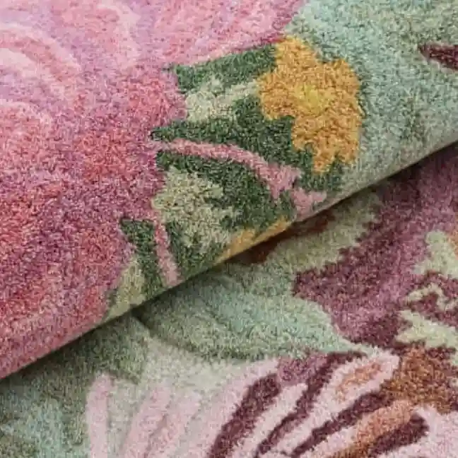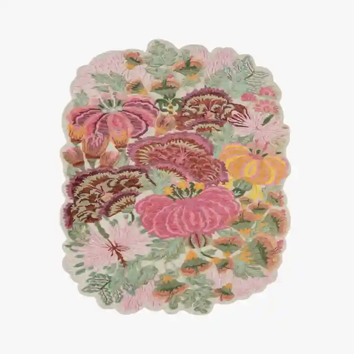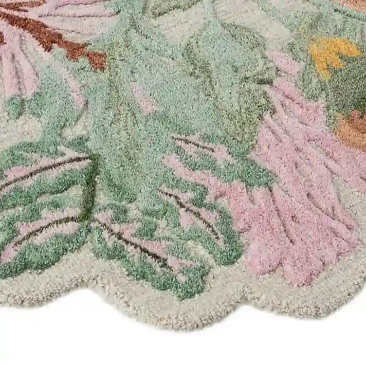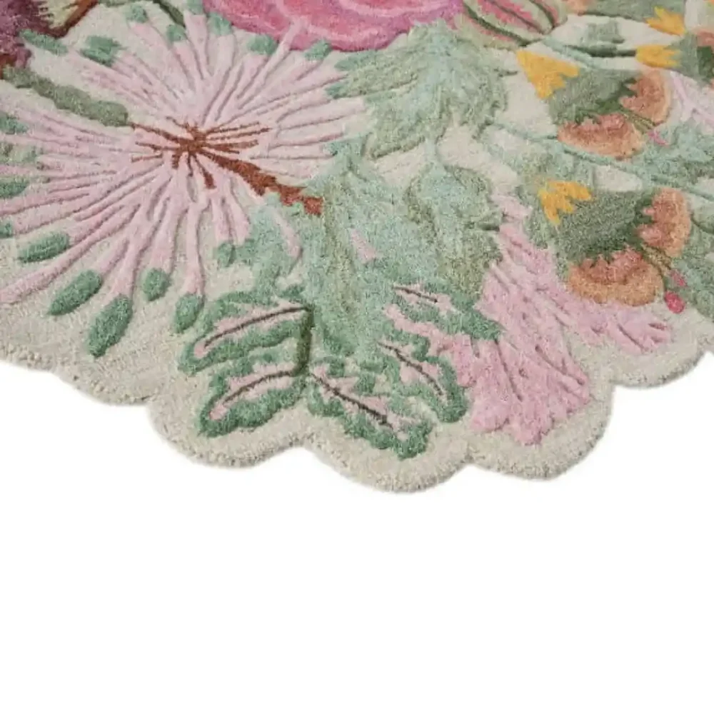 The Elegant Floral rug showcases an exquisite floral design, blending soft pinks, greens, and warm tones to create a timeless and inviting atmosphere. Its scalloped edges enhance the organic beauty, making it a perfect statement piece for living rooms, bedrooms, or elegant lounges. Made with premium materials.Key Features of Floral Rug