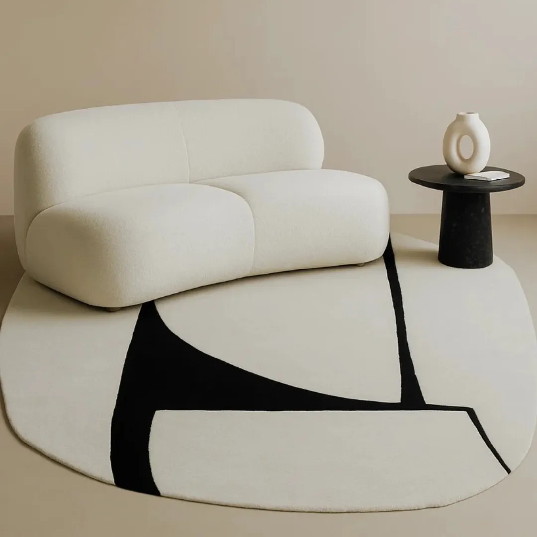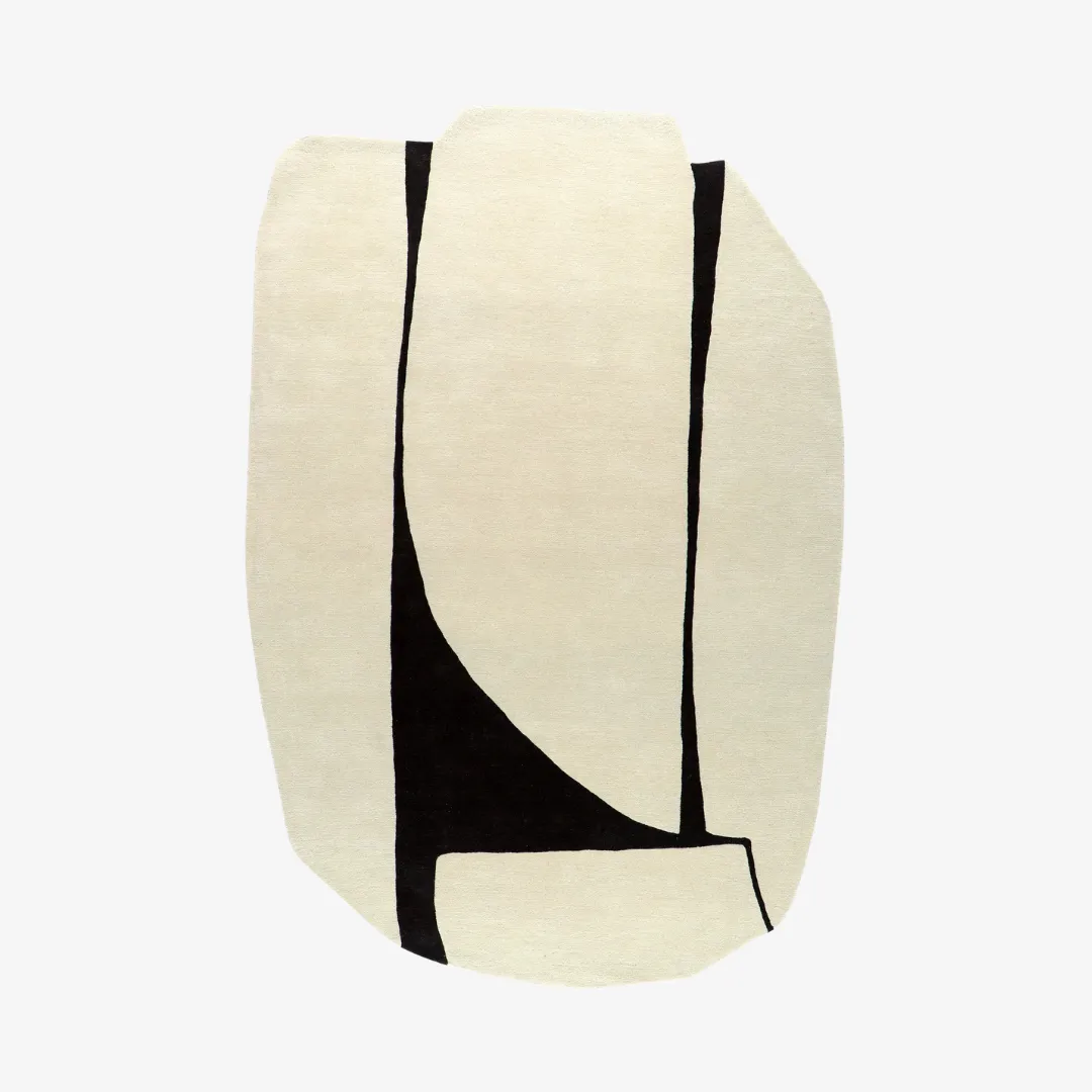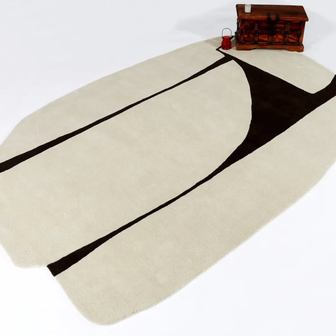 The Gran Beige – Hand Tufted Rug blends art and function in a sculptural form. This irregularly shaped rug breaks away from the traditional rectangle, offering an organic silhouette that feels gallery-ready. Its bold black strokes sweep across a soft beige base, resembling brushstrokes or cast shadows in modern sculpture. Handcrafted with 100% New Zealand wool, it offers both visual drama and soft comfort underfoot. Whether placed in a modern living room or a creative studio, it delivers a refined, artistic touch.Key Features of the Gran Beige Rug