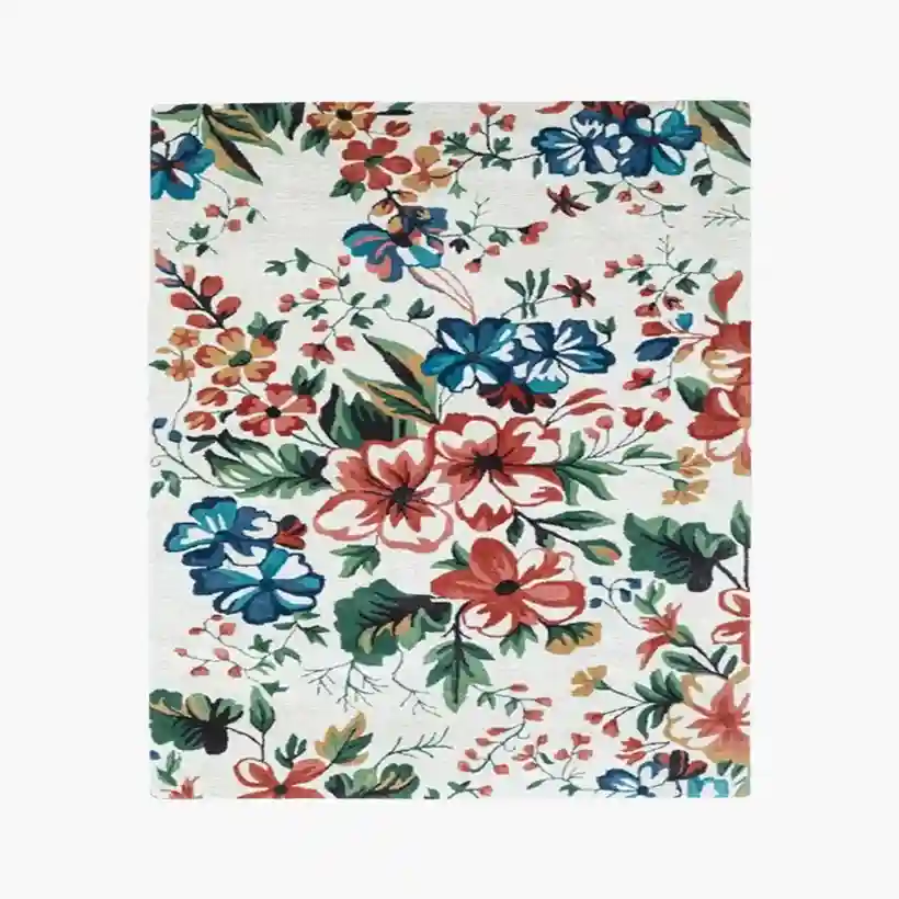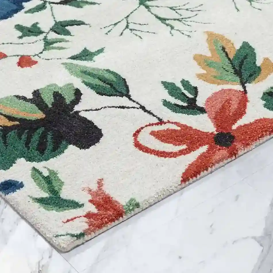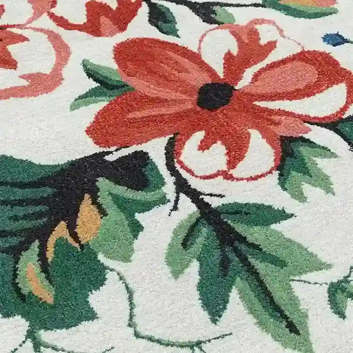The Mahoora Moth Rug displays a white base, making it a unique choice among white area rugs, with a vibrant red and blue flower. It is a symbol of focus, balance, and luxury. This rug adds a sense of motion and energy to your home.Key Features for Moth Rug