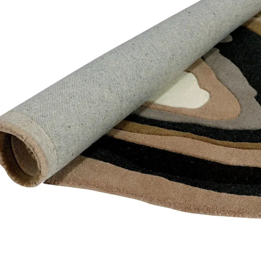 The Niva Brown – Hand Tufted Rug brings a natural, sculptural energy to your interior. With an irregular silhouette inspired by tree rings or rock formations, this rug feels as though it’s been carved from the earth. Its fluid, non-symmetrical shape instantly softens modern lines and introduces a grounded artistic mood. Layered bands in earthy tones—brown, camel, charcoal, tan, and off-white—mimic the striations of agate or geological layers. Each hue blends harmoniously, creating a warm and grounding aesthetic.Key Features of the Niva Brown Rug