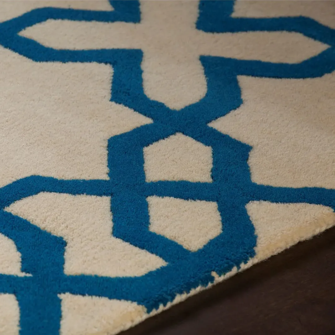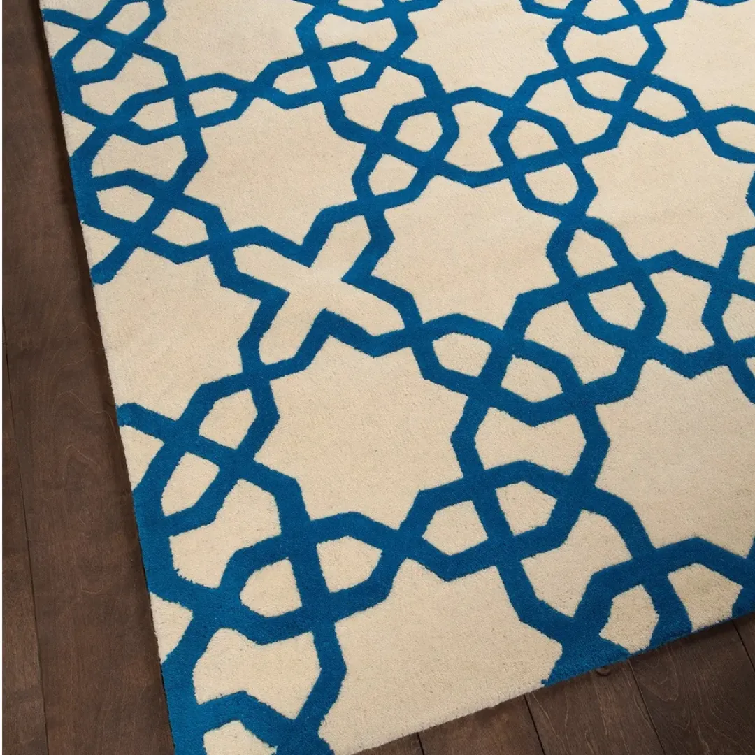 The Ocean Star geometric wool rug helps to bring simplicity and boldness to your space. This rug design features a beautifully geometric design with star-shaped patterns in rich blue tones over a soft cream background. It is hand tufted by Skilled artisans using premium organic wool. This rug is perfect for anyone who loves a structured look that still feels warm and personal.Key Features of White Rug