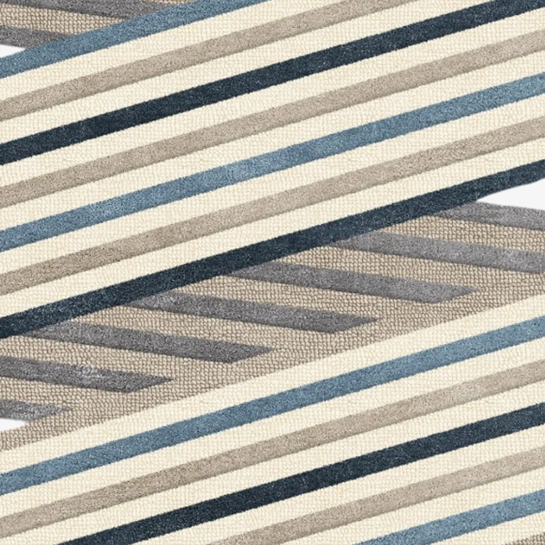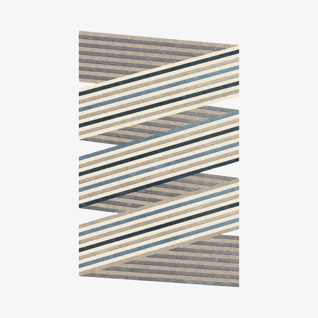 The Parallax Gray– Hand Tufted Rug adds bold style and movement to your room. Its shape is not like a regular rectangle. It has a zigzag edge and slanted lines that look like steps or stairs. This creates a cool 3D effect on the floor. The rug mixes soft and rich colors like gray, ivory, taupe, navy blue, and dusty blue. These shades go well with modern, simple, or mid-century decor. The texture also changes across the rug with flat and loop pile areas, giving it a soft feel and interesting look. This gray rug feels wonderfully soft underfoot while adding sculptural interest to your room.Key Features of Gray Rug