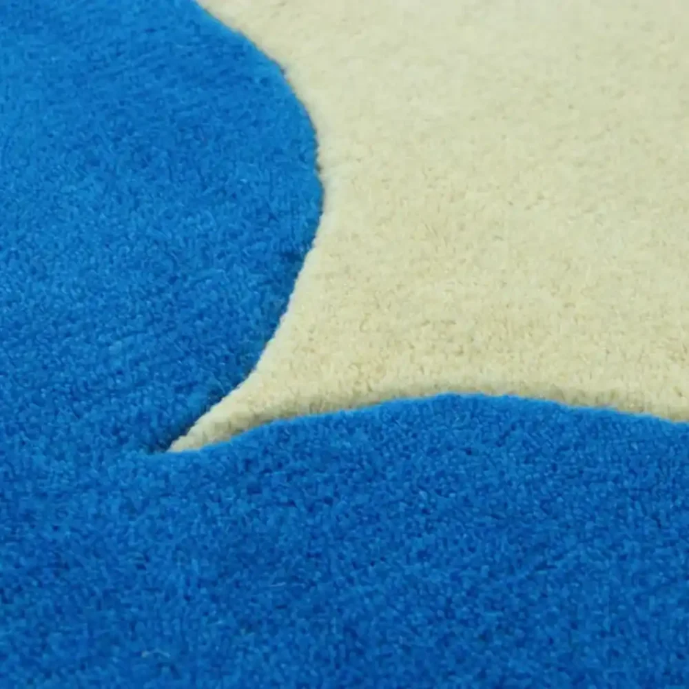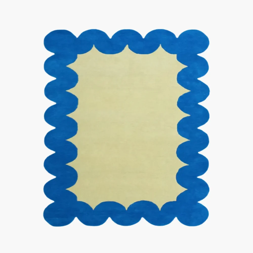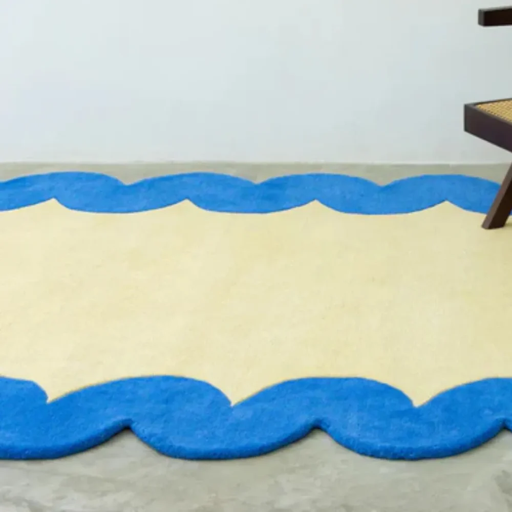 The Scallop Dream Rug blends minimalist charm with a whimsical, artistic touch. Its soft cream center is framed by a vibrant blue scalloped border, creating a bold contrast that is both playful and sophisticated. The rounded edges give it a modern yet cozy appeal, making it perfect for contemporary, eclectic, and Scandinavian interiors.