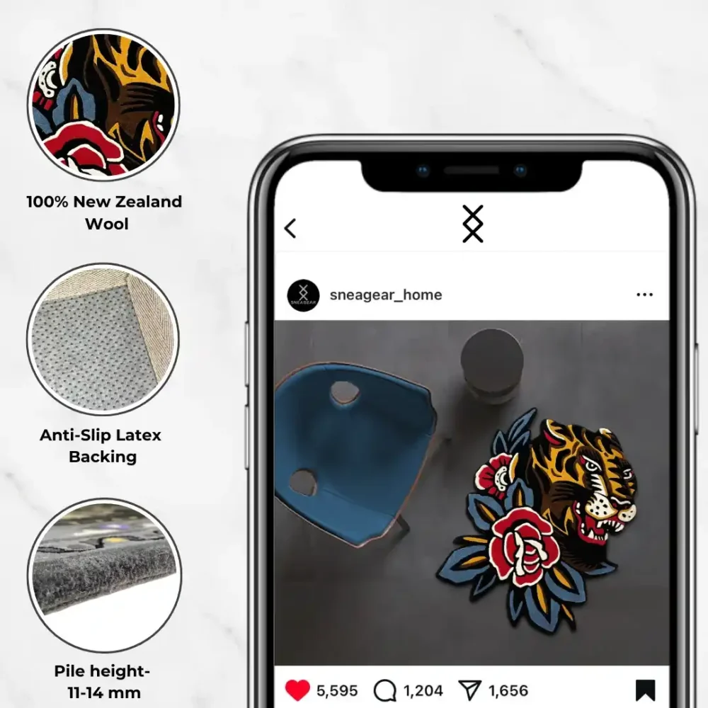 The Bert Grimm Tiger Rug symbolizes strength, courage, and wild beauty. Our Rug captures the beauty of a tiger. This design adds a floral touch to your home. Our Tattoo rugs combine artistic art with modern style. Own a piece of tattoo history—order your Bert Grimm Tiger Rug today!