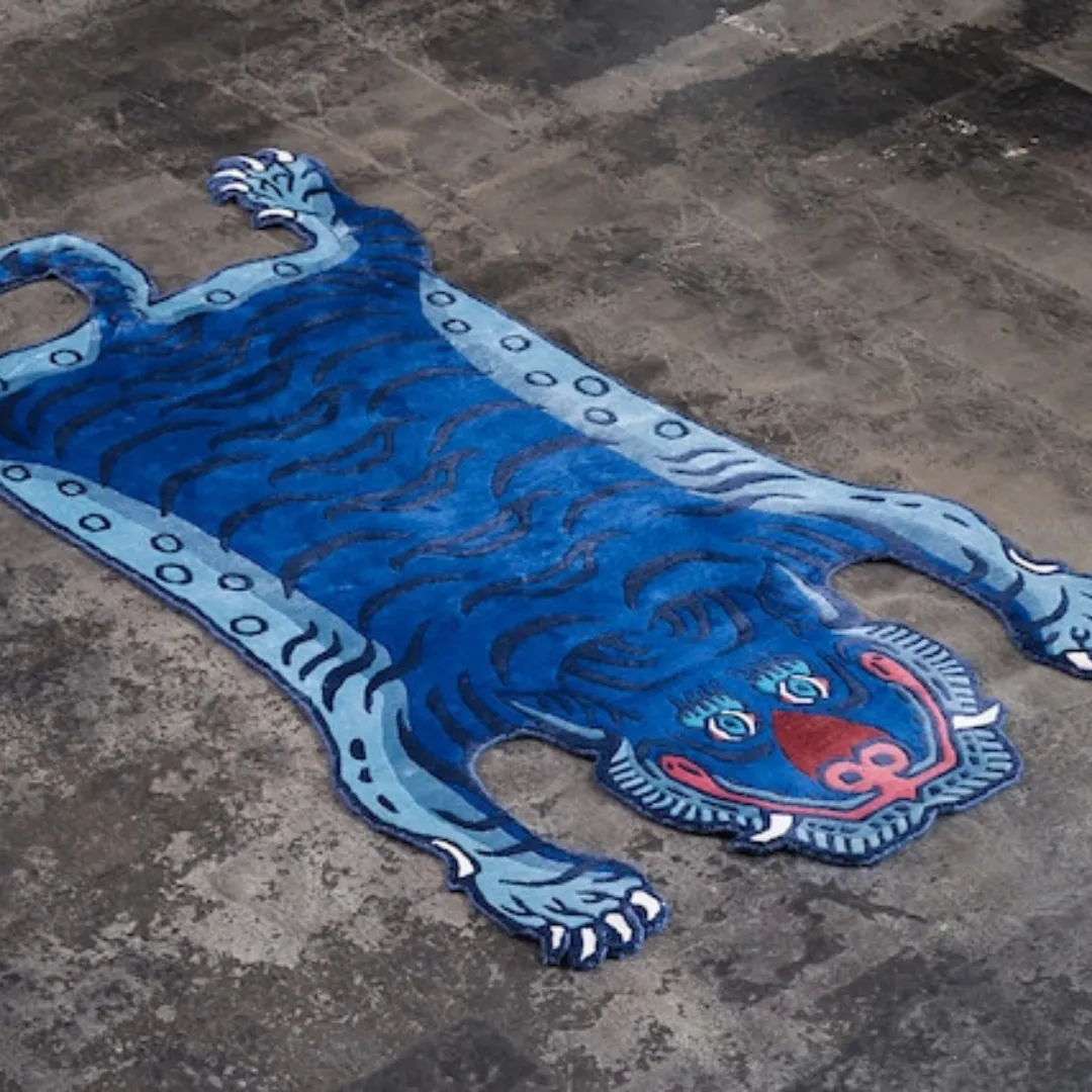The Blue Mirage Tibetan Tiger adds positive charm to any room. The design is inspired by traditional Tibetan tiger rugs and has blue base, dark blue stripes, and a tiger face with blue eyes and a red smile. Tibetan Lamas used to use these rugs as protective symbols during meditation and rituals. This rug is hand tufted using organic wool by skilled Tibetan artisans. This rug offers both comfort and craftsmanship. It looks great in bedrooms, studios, or any other room that needs an eye-catching rug.Key Features of Tibetan Tiger Rug