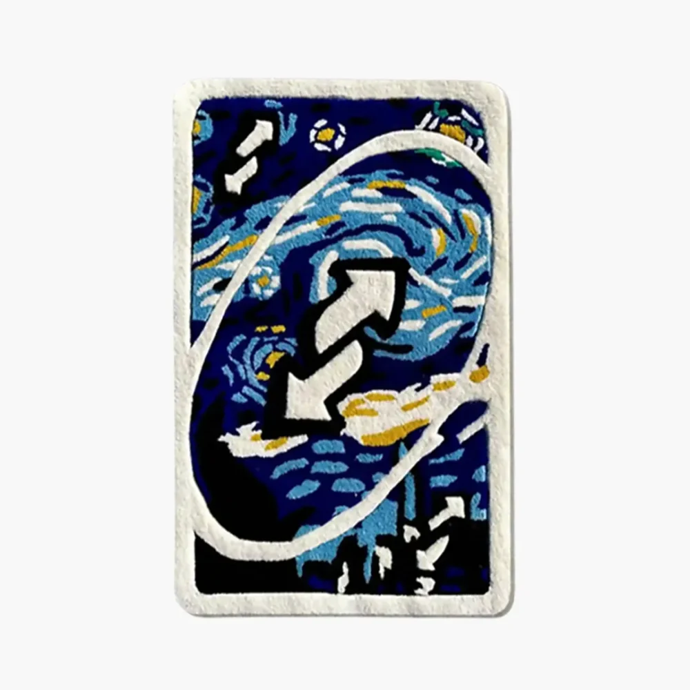 The Blue Starry Night Uno Reverse Card Rug features an intriguing design that infuses your space with creativity and sparks joy during gatherings.