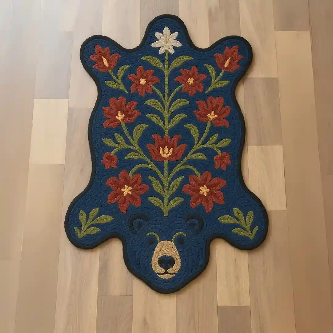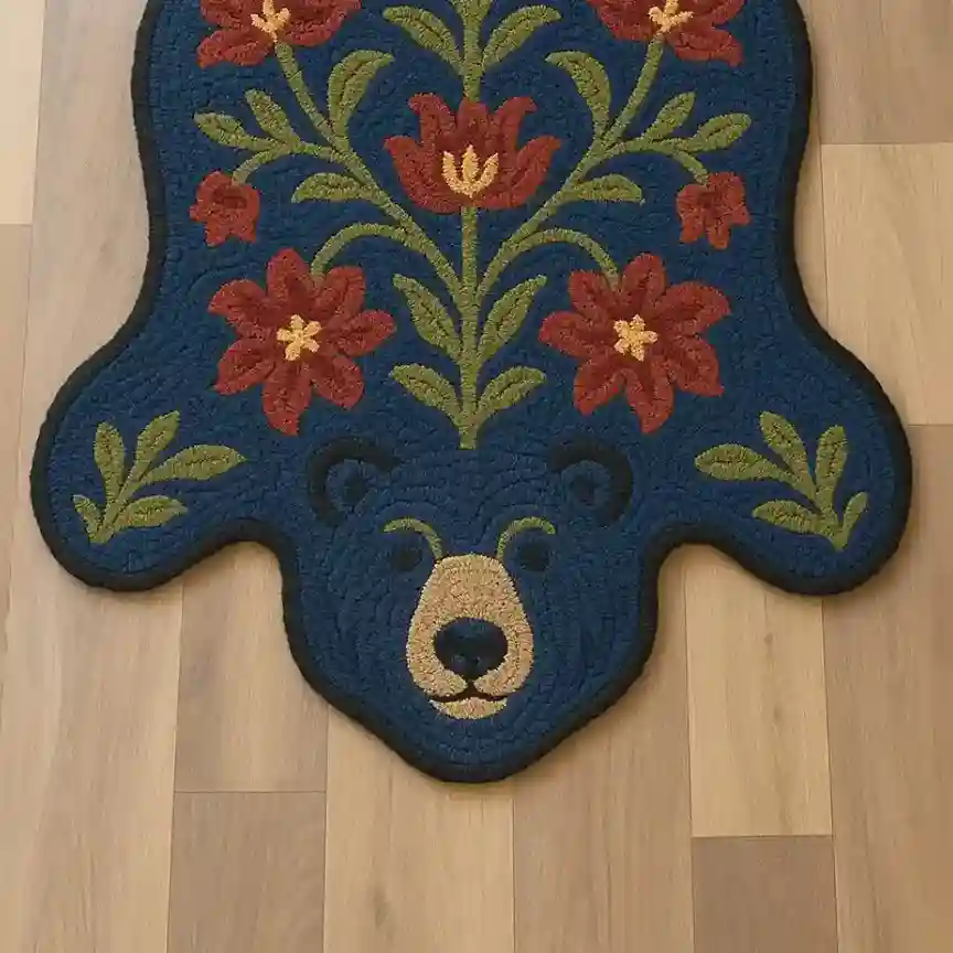 The Blue Bear Area Rug features a white animal with a green ear, set on a soft base. This design adds a touch of strength and wisdom to your home. Our orange floral bear rug is a one of a kind creation.Key Features for Bear Area Rug