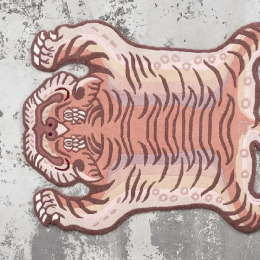 The Blush Pink Tibetan Tiger Rug adds positive charm to any room. The design is inspired by traditional Tibetan tiger rugs and has a Pink color, pink stripes, and a tiger face with white eyes and a pink smile. Tibetan Lamas used to use these rugs as protective symbols during meditation and rituals. This rug is hand tufted using organic wool by skilled Tibetan artisans. This rug offers both comfort and craftsmanship. It looks great in bedrooms, studios, or any other room that needs an eye-catching rug.Key Features of Tibetan Tiger Rug