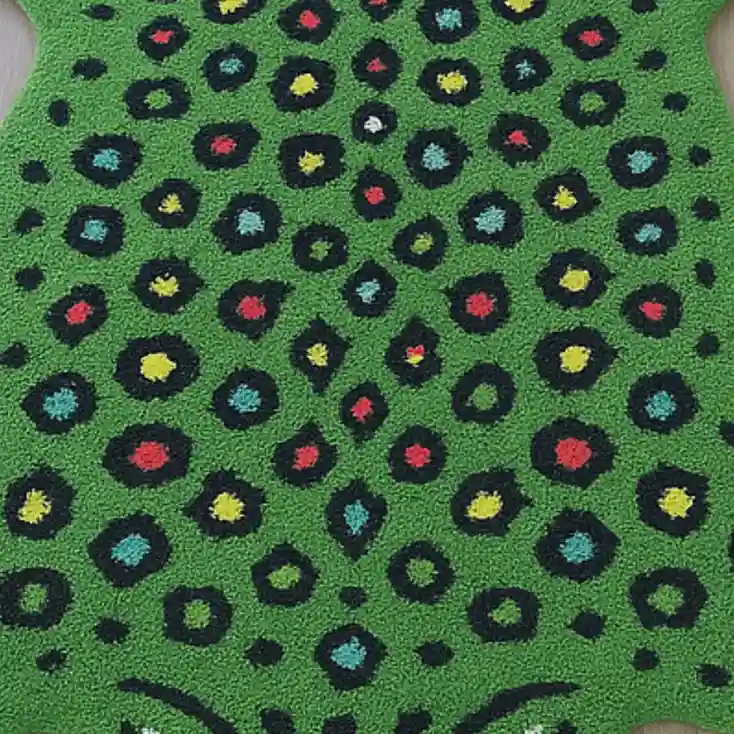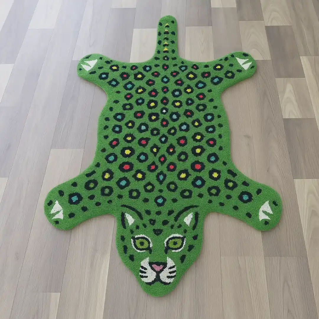 The Green Leopard Area Rug features an animal print with white eyes, set on a soft base. This design adds a touch of strength and peace to your home. Our dotted leopard rug is a one of a kind creation.Key Features of Leopard Area Rug