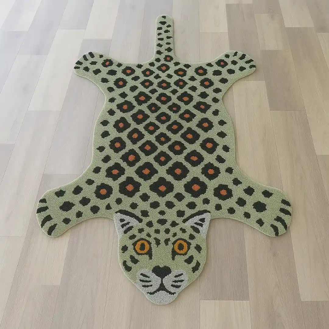The Green Zircon Leopard Rug features a green animal with a brown ear, set on a soft base. This design adds a touch of strength and wisdom to your home. Our dotted leopard rug is a one of a kind creation.Key Features for Green Leopard Rug