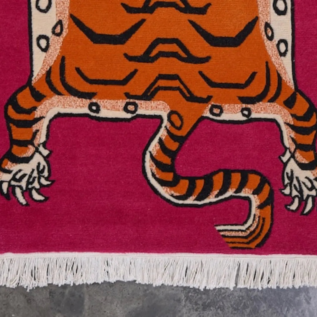 The Pink Tibetan Tiger Meditation Rug helps to bring calm and focus to your space. This rug displays a bright orange tiger on a pink background. In Tibetan tradition, people believe that sitting on a tiger rug during meditation protects them from negative energy. This rug is hand tufted by Tibetan artisans using organic wool. This rug is perfect for meditation, yoga, and can be used for home decor.Key Features of Tibetan Tiger Rug