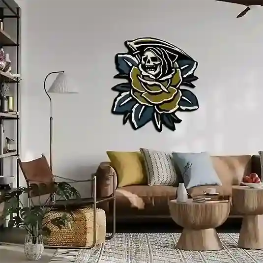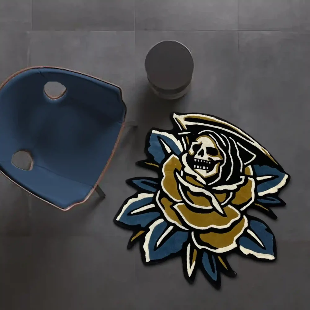 The Reaper Rose Area Rug features a gothic figure. The flower rug features a dark, bold mystery. This design adds a vintage touch to your home. Our Tattoo rugs combine artistic art with modern style. Own the darkness—order your Reaper Rose Rug today!Key Features for Reaper Rose Tattoo Rug