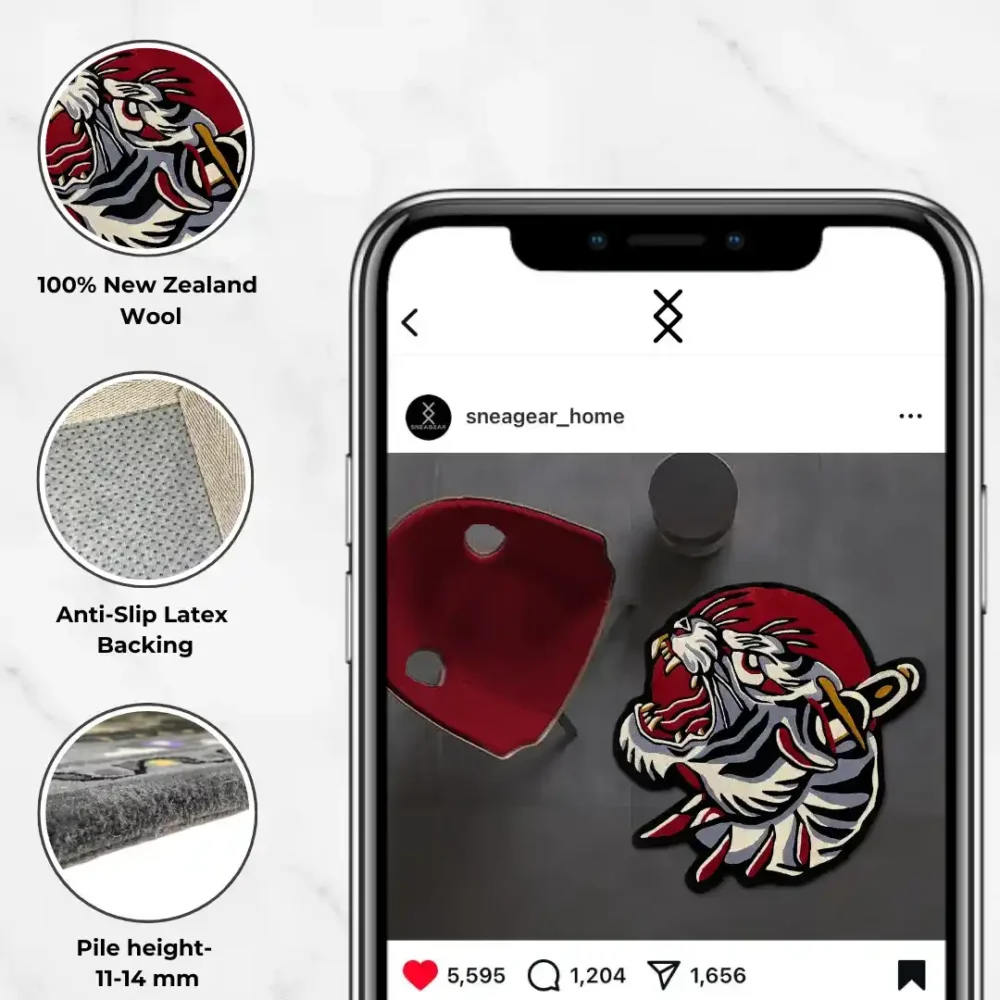 The Sun Tiger Area Rug features a bold tiger face. The sun tiger rug features strength, courage, and wild beauty. This design adds a Gothic touch to your home. Our Tattoo rugs combine artistic art with modern style. Unleash the power of the tiger—order your Sun Tiger Rug today!Key Features of Sun Tiger Rug