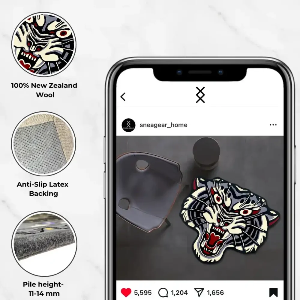 The Tiger Head Rug features a bold tiger face. The tiger rug features strength, courage, and wild beauty. This design adds a Gothic touch to your home. Our Tattoo rugs combine artistic art with modern style. Dominate your space with the Tiger Head Rug—order now!Key Features for Tiger Area Rug