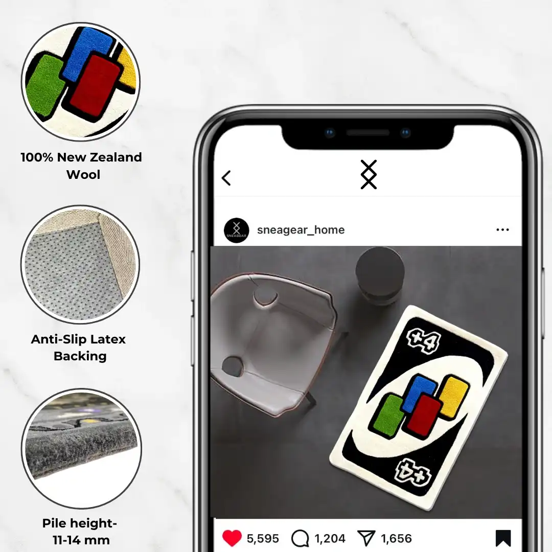 Bring a playful touch to any space with Sneagear’s captivating UNO card area rug! It features the following:
