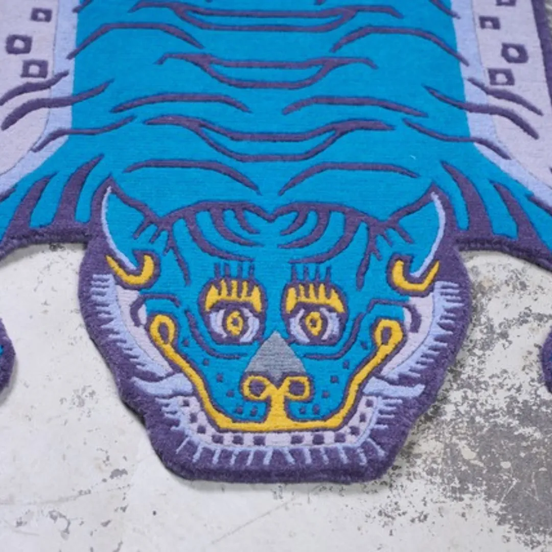 The Blue Tibetan Tiger Rug adds positive charm to any room. The design is inspired by traditional Tibetan tiger rugs and has a blue color, bold stripes, and a tiger face with blue eyes and yellow lips. Tibetan Lamas used to use these rugs as protective symbols during meditation and rituals. This rug is hand tufted using organic wool by skilled Tibetan artisans. This rug offers both comfort and craftsmanship. It looks great in bedrooms, studios, or any other room that needs an eye-catching rug.Key Features of Tibetan Tiger Rug