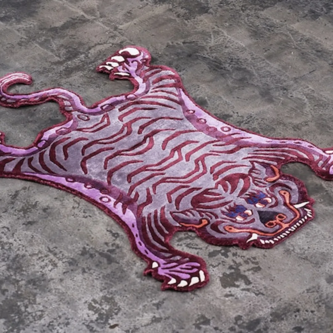 The Violet Fury Tibetan Tiger adds positive charm to any room. The design is inspired by traditional Tibetan tiger rugs and has violet, purple stripes, and a tiger face with white eyes and a pink smile. Tibetan Lamas used to use these rugs as protective symbols during meditation and rituals. This rug is hand tufted using organic wool by skilled Tibetan artisans. This rug offers both comfort and craftsmanship. It looks great in bedrooms, studios, or any other room that needs an eye-catching rug.Key Features of Tibetan Tiger Rug