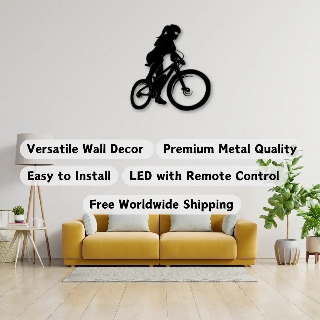 Pedal into style with Sneagear’s Woman on Bike Silhouette. This dynamic weatherproof metal wall decor, lit with LED RGB lighting, is all about that cycling life. Perfect for your home gym or any room where you want to show off your love for bike rides and adventure – INSTALL IT IN NO TIME!