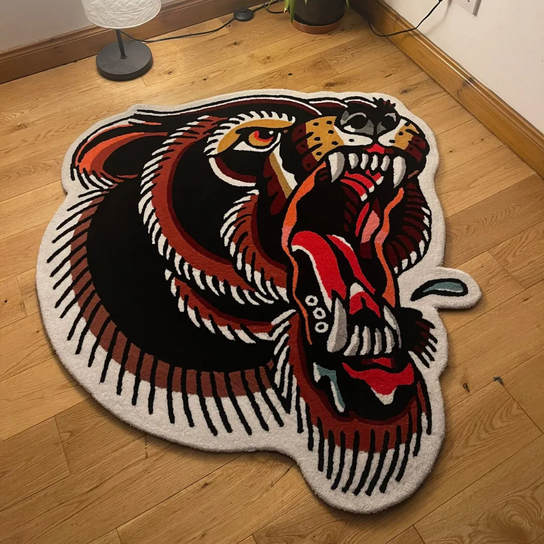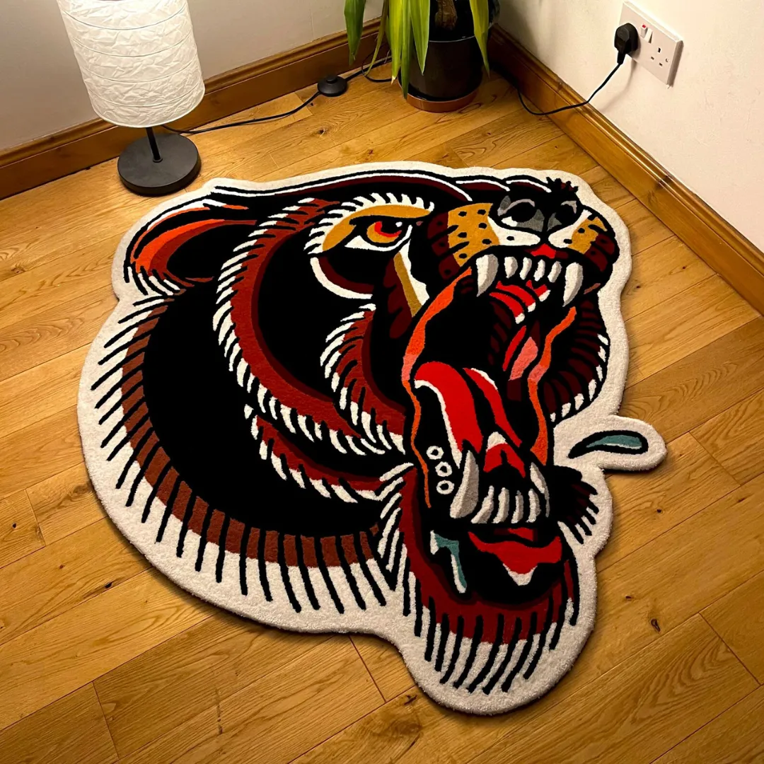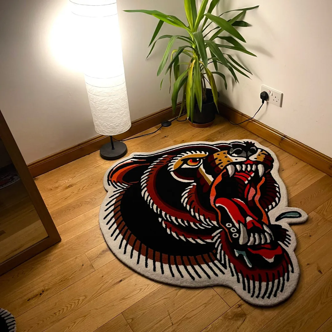 This Black Tiger Tattoo Rug. Designed to make a strong first impression, the rug features an aggressive open-mouth tiger face inspired by classic tattoo art. Hand-tufted from high-quality wool, it brings sharp detail and bold color to life. Love this design. Check out our traditional tattoo rugs collection for more.Key Features of Tiger Tattoo Rug