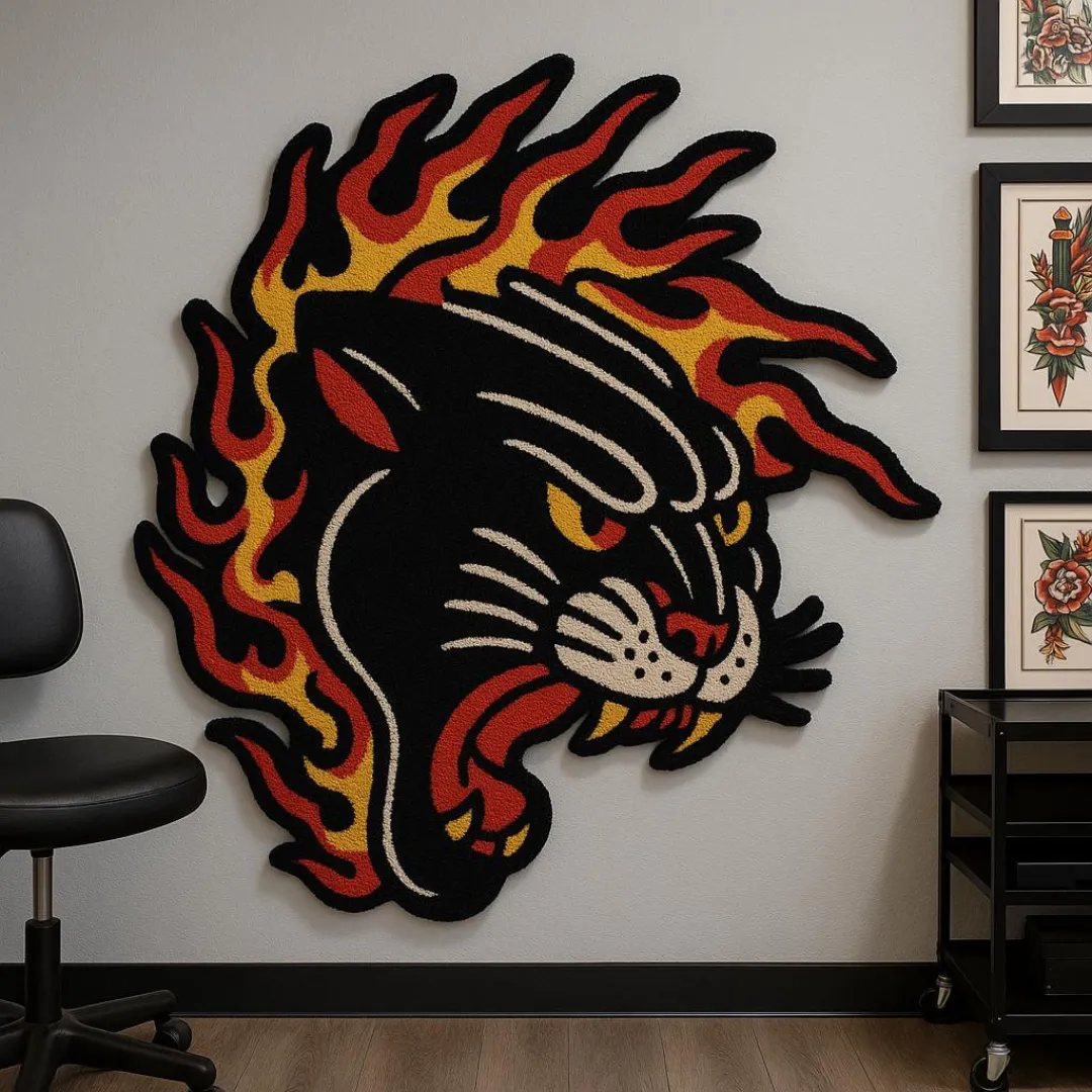 The Flame Panther Tattoo Rug adds energy to any space. The fearsome panther’s head design with bright flames creates a fearless look. The strong composition of bright colors captures the spirit of old-school tattoo culture. This rug is a great piece for rooms with bold character and strong visual identity. Also, explore our more Tattoo Rug collection.Key Features of Flame Panther Rug