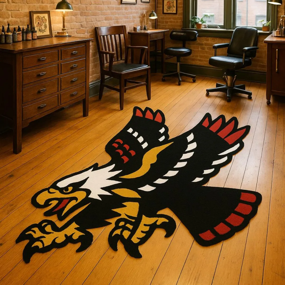 The Flying Eagle Tattoo Rug is inspired by a classic traditional tattoo art. This hand-tufted rug is a tribute to freedom, power, and timeless ink culture. Each rug is handmade, blending ancient craftsmanship with a modern edge. Love this tattoo design. Check out our traditional tattoo rug collection for more.Key Features of Flying Eagle Tattoo Rug