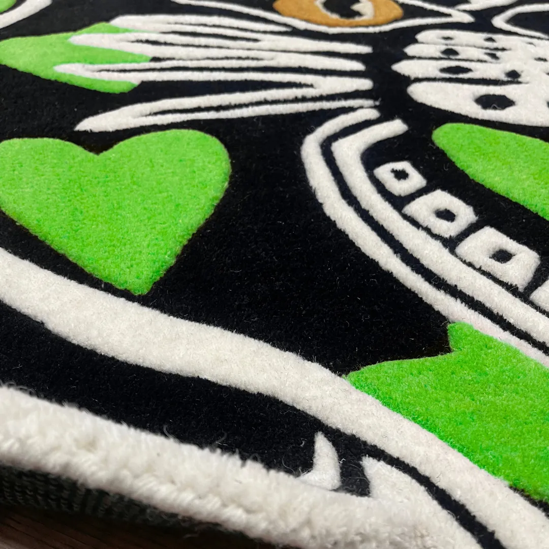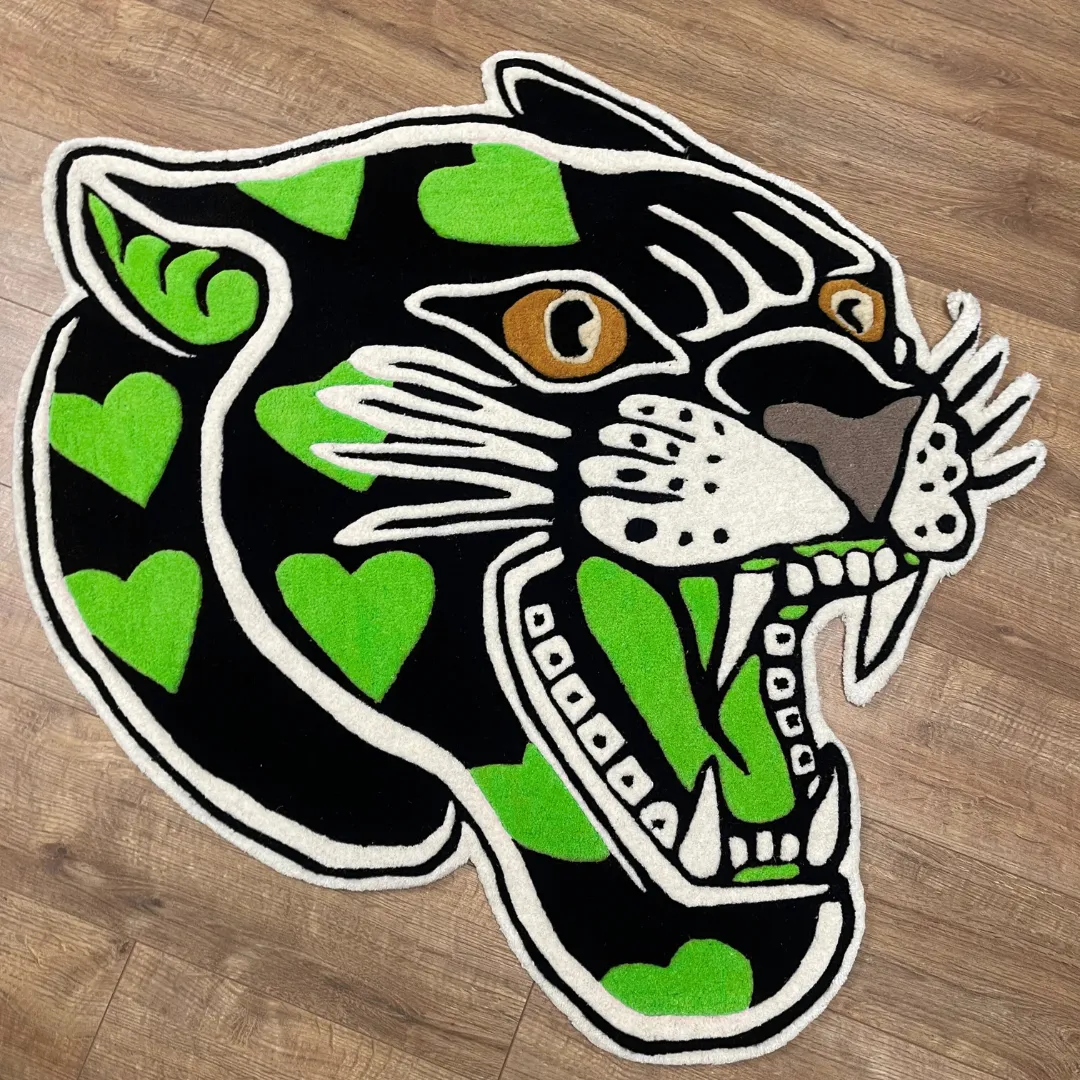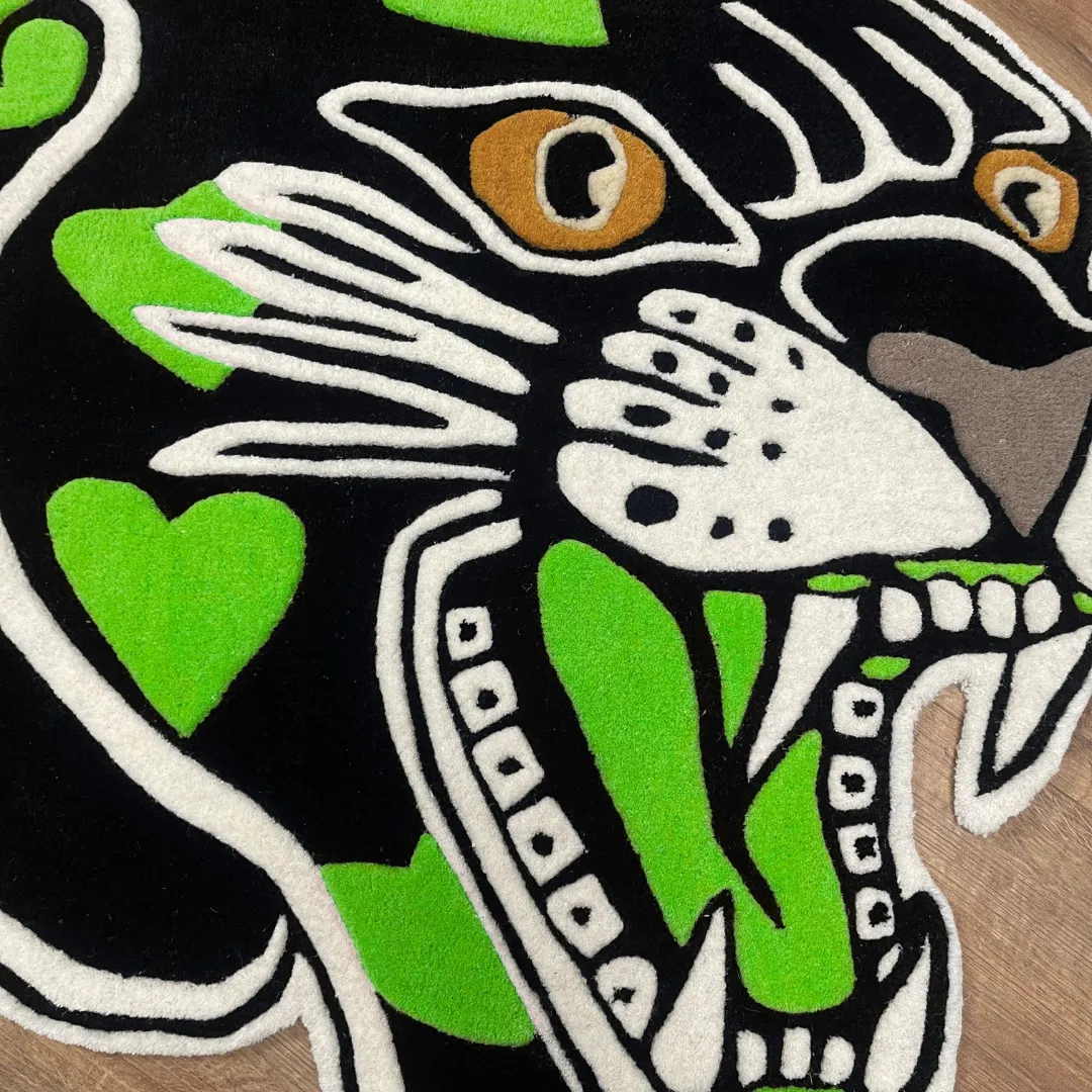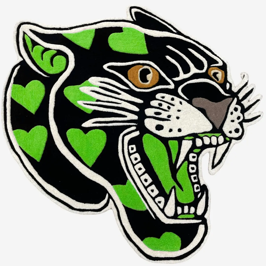This Green Panther Head rug is inspired by traditional tattoo art. This design features a custom-shaped panther head rug with black background and green heart patterns, featuring fierce teeth and golden eyes in a tattoo-inspired design. It’s hand-tufted by Skilled artisans using premium organic wool. Love this tattoo design. Check out our traditional tattoo rug collection for more.Key Features of the Green Panther Heart Rug