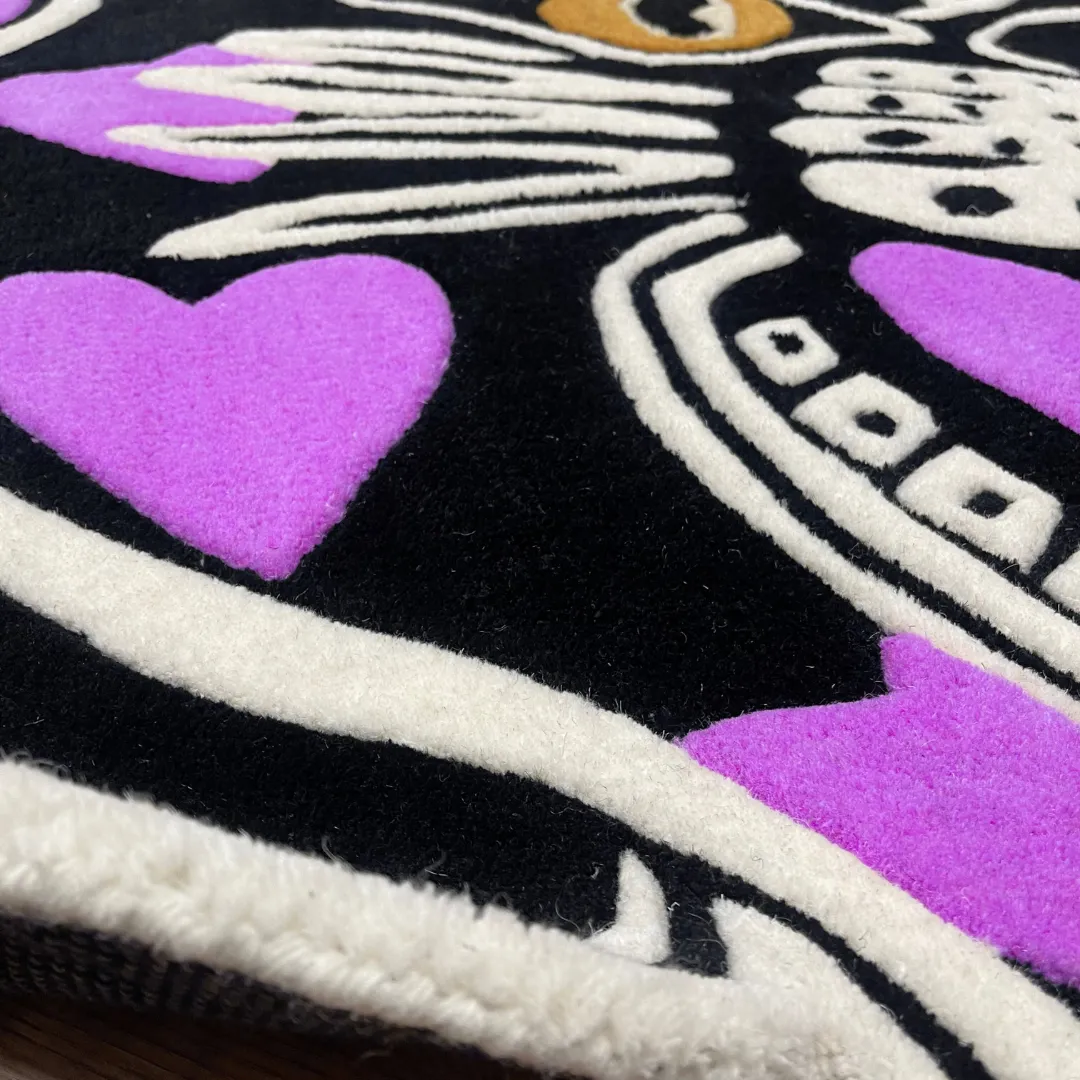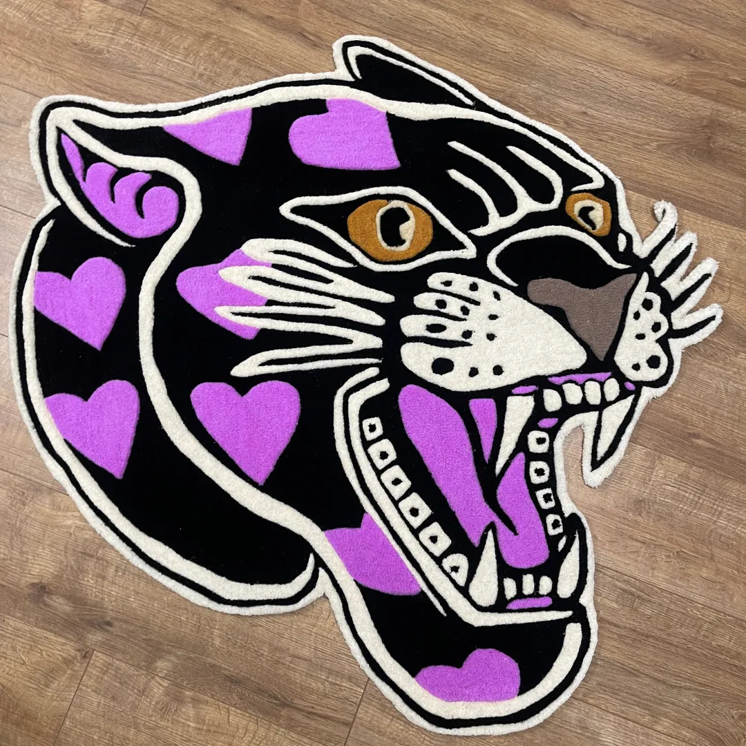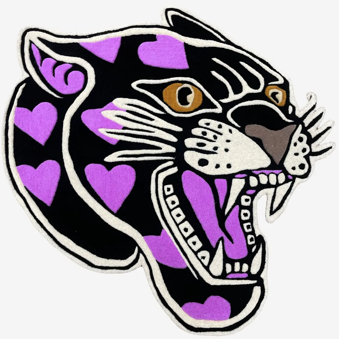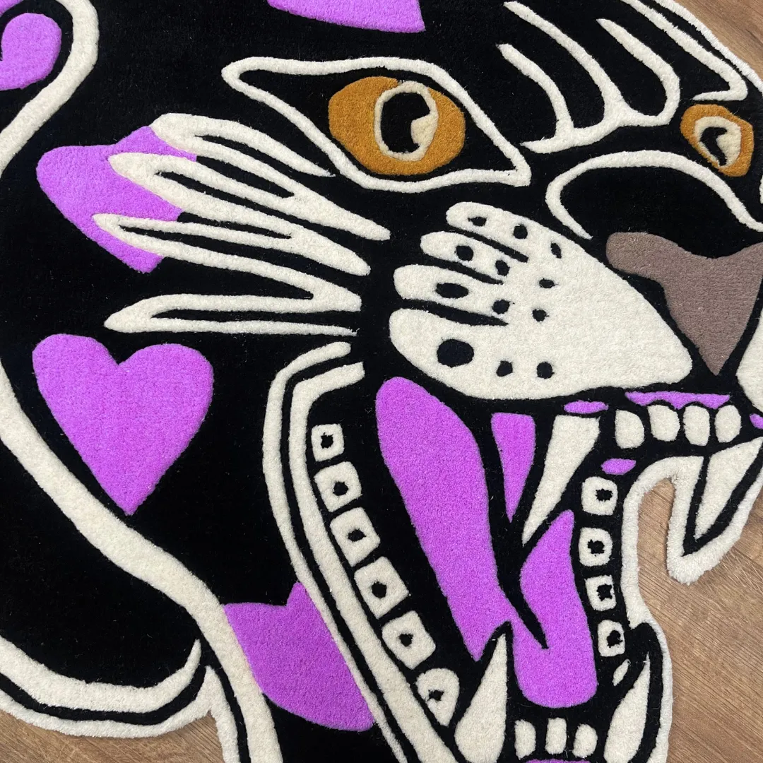 This Purple Panther Head rug is inspired by traditional tattoo art. This design features a custom-shaped panther head rug with black background and purple heart patterns, featuring fierce teeth and golden eyes in a tattoo-inspired design. It’s hand-tufted by Skilled artisans using premium organic wool. Love this tattoo design. Check out our traditional tattoo rug collection for more.Key Features of the Purple Panther Heart Rug
