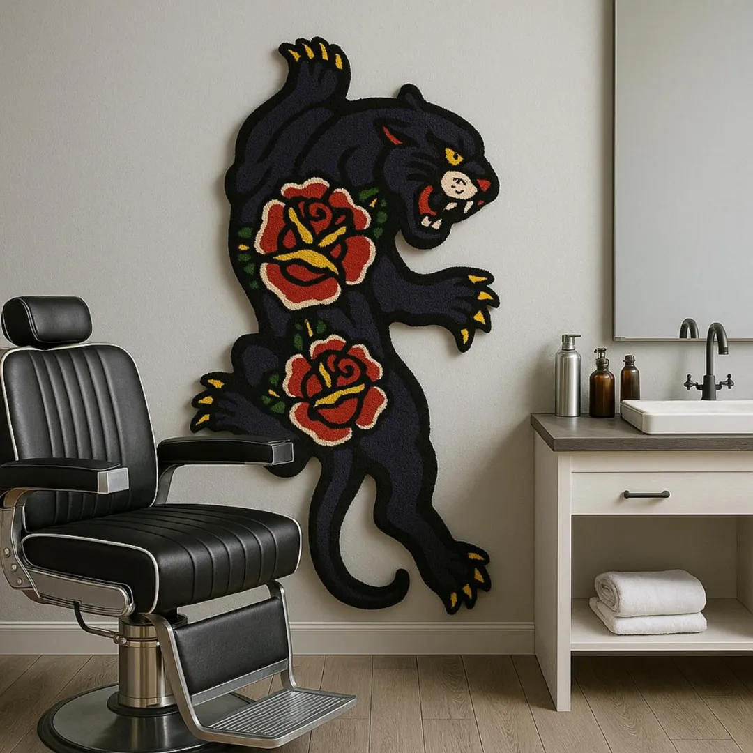 Here are some key features of this tattoo rug;- Design: Tattoo-style panther with traditional rose detailing.