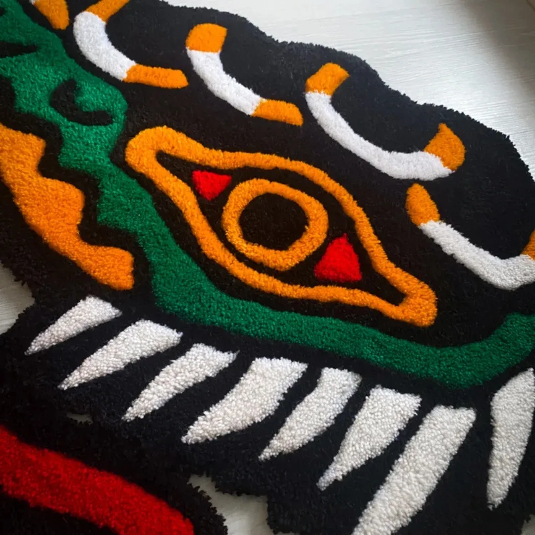 Here are some key features of this tattoo rug;- Design: Unique snake head shape with tattoo-style art.